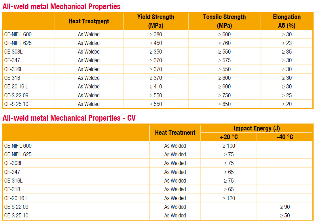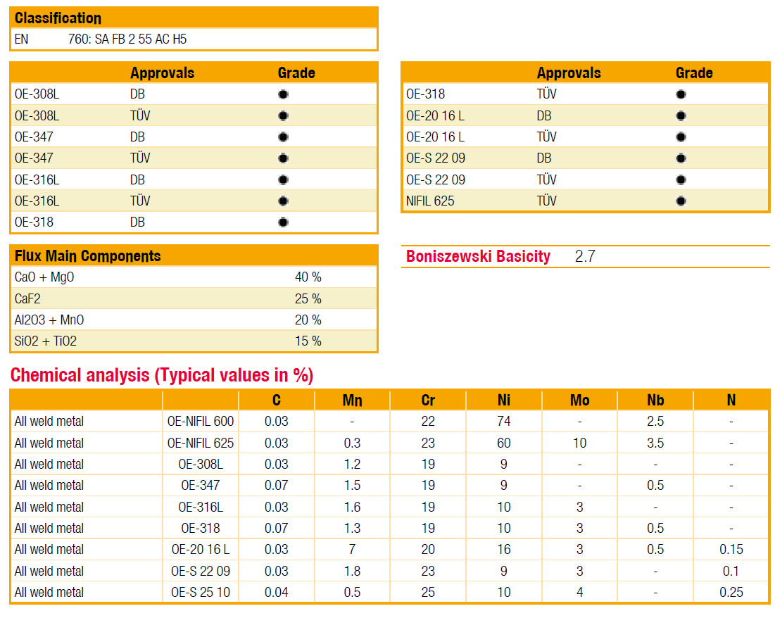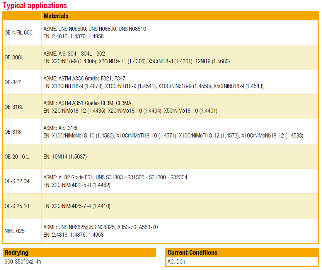 - OE-318 ASME: AISI 318L EN: X10CrNiMoNb18-10 (1.4580), X10CrNiMoTi18-10 (1.4571), X10CrNiMoTi18-12 (1.4573), X10CrNiMoNb18-12 (1.4583)