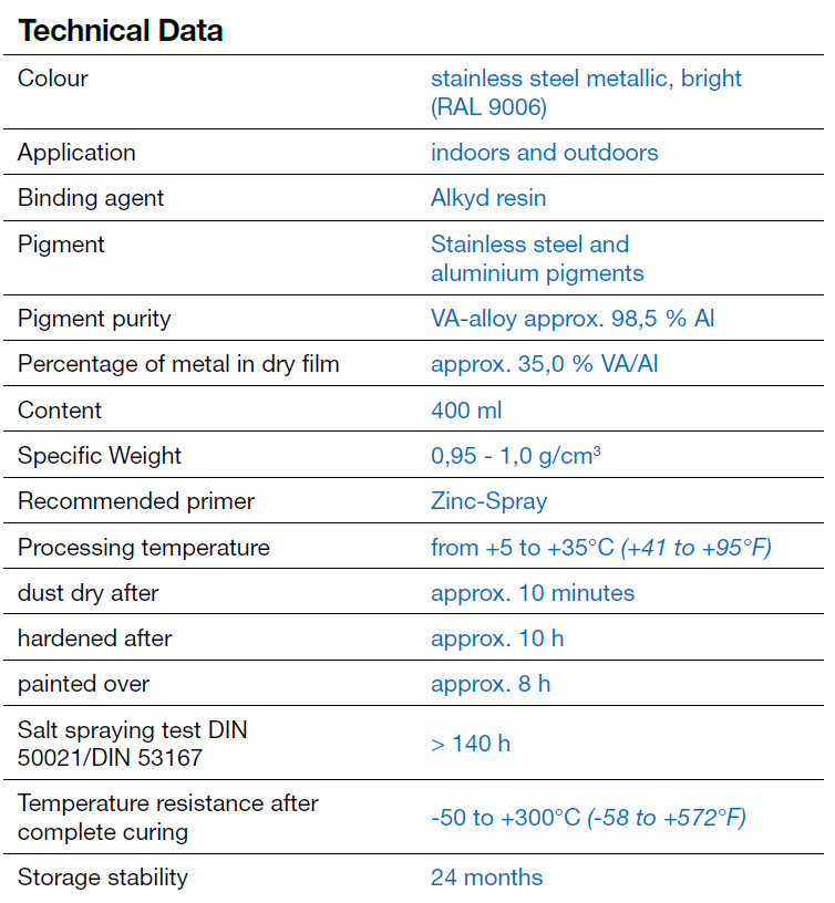 WEICON Stainless Steel Spray „bright grade“ is a chemical, corrosion and weather resistant surface coating on the basis of acrylic resin and stainless steel pigments. It is temperature resistant up to +300°C for short periods and provides a treated stainless steel look.