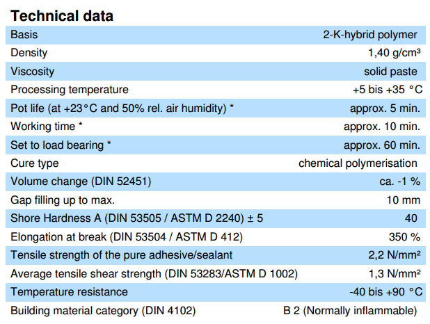 Flex 310 M 2 K is a strong 2-component system on a hybrid polymer basis which enables fullsurface bonding of larger parts and which can be used to fi ll gaps of up to ten millimetres. It is suitable for the bonding of almost all materials such as metal and many plastics.