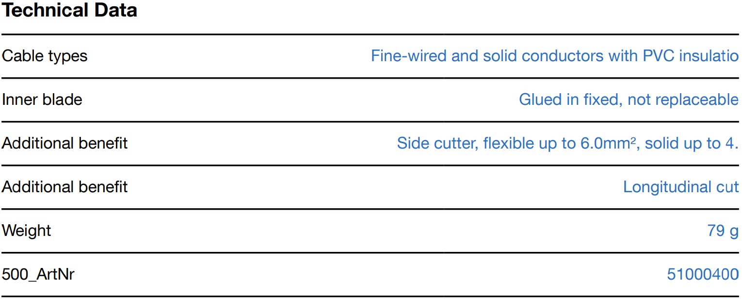 Working area: 0.5 - 6 mm² / 8 - 13 mm Ø. Accurate removal of covers even in hard-to-reach places. Safe and compact storage thanks to the clasp.