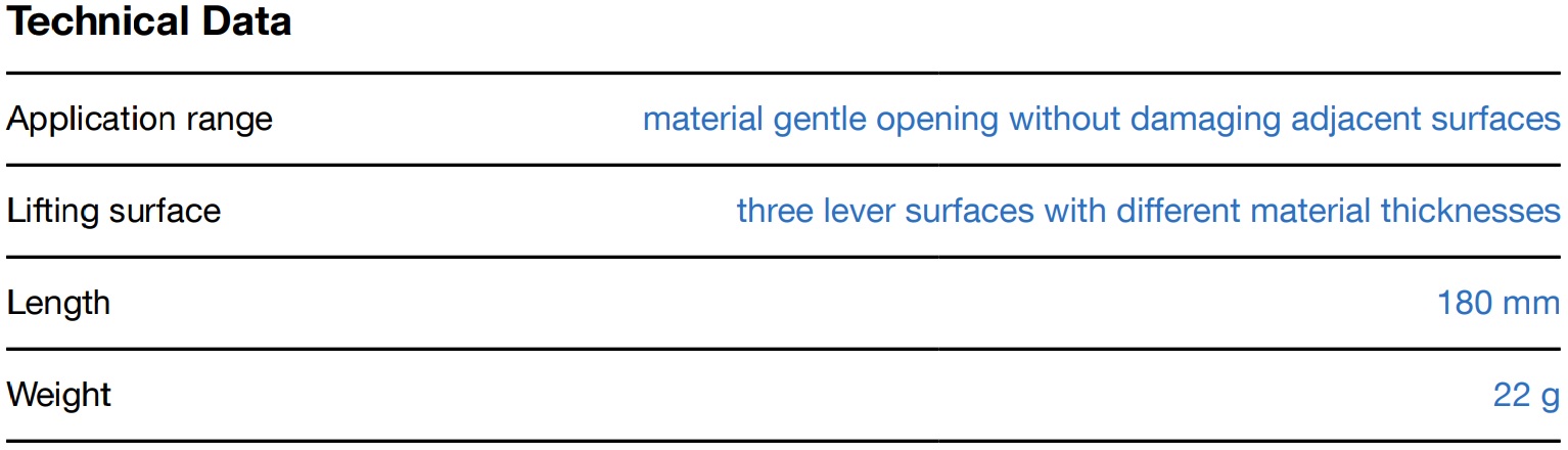 Ideal for loosening, switches, luminaires or similar components filigree, slim design – flexible and stable at the same time three levers surfaces with different material thicknesses.