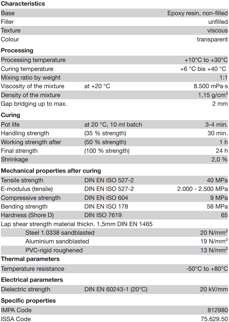 WEICON Epoxyd Minute Adhesive bonds fiber-reinforced materials, plastics, stone, glass, wood, ceramics, metals and many other materials. It is used where a manual dispenser is not needed.