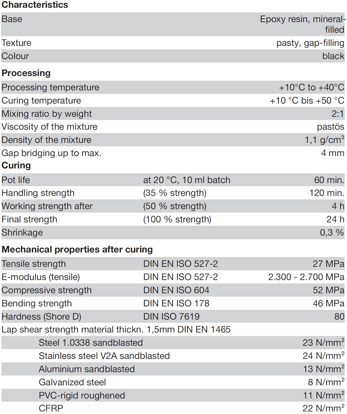WEICON Easy-Mix HT 180 is a 2-component epoxy adhesive. The product is resistant to high temperatures up to + 180°C and briefly up to + 230°C. The adhesive is very viscous and stable, also suitable for vertical applications. It is particularly suitable for joining composite materials as well as plastics, ceramics, glass and wood. High temperature resistance enables gluing of elements, which are then thermally varnished (powder coated).