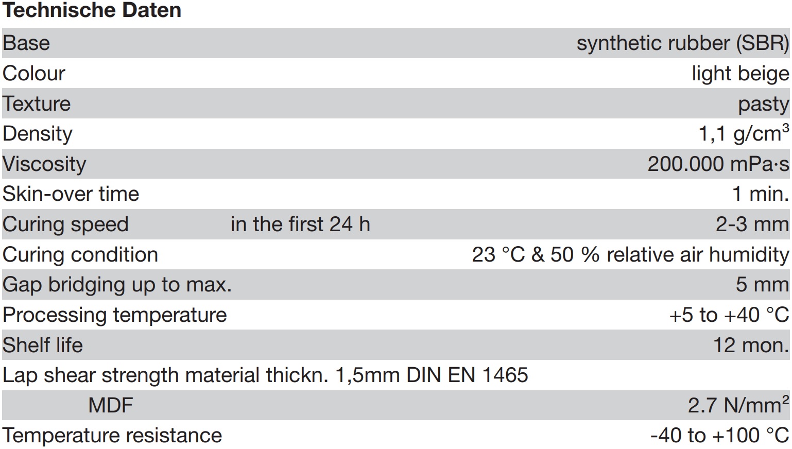 Fast and strong contact adhesive based on synthetic rubber for bonding indoors and outdoors. Flexible 1-component, can be used on many materials, such as: wood and wood fiber boards, MDF and OSB boards, decorative boards, steel, aluminum, plastics, PVC, plasters, gypsum boards, ceramics, masonry, tiles, stone and concrete. The adhesive is suitable for quick and permanent attachment of skirting boards, panels, floor elements, wall paneling, window sills, door thresholds, wooden door frames, decorative profiles and many others.