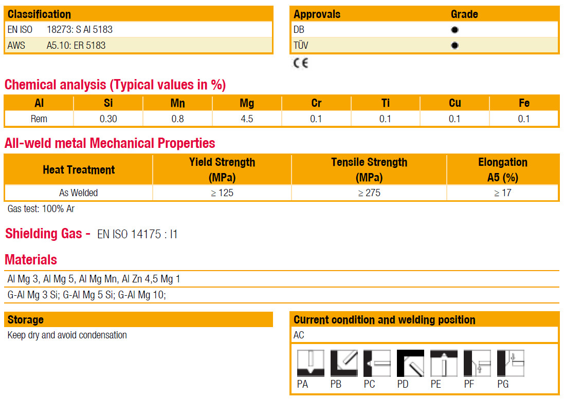 ALUROD AlMg4.5Mn is a 5183 type aluminum solid TlG welding rod depositing Al-4.5Mg0.7Mn weld metal. Suitable for use with Ar, or Ar+He mixed shielding gases.