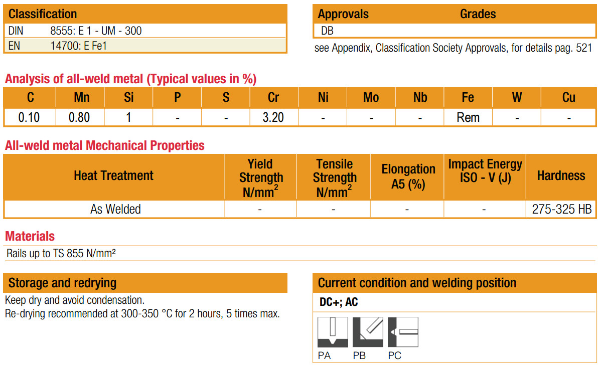 Thick basic coated MMA electrode for producing hard facing deposits of medium hardness, which can be machined by chipforming. Particularly suited for wear resisting parts subjected to heavy impact and shock. CITORAIL can be easily welded in all positions, except vertically-down. Weld metal is crack resistant and free of pores. Suitable for reconditioning of rails, rail crossings, switch points, sprockets and wearing parts, such as rope pulleys, tumblers, rollers, caterpillar track rollers and links, wheel flanges, stud links and others. One package contains approximately 35 pieces. The weight of the package is 5.2 kg.