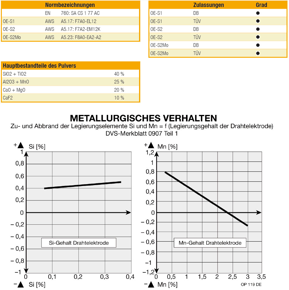 OP 119 ist ein agglomeriertes Schweißpulver der Calcium-Silikat-Typengruppe für das Schweißen von allgemeinen Baustahlen, Kesselbaustählen, Rohrstählen sowie Feinkornbaustählen. Im besonderen ist OP 119 geeignet für das Mehrdrahtverfahren bei hoher Geschwindigkeit. Die Schlackenentfernbarkeit ist in allen Fällen gut. Es entsteht eine kurze Schlacke, d. h. es können Rundnähte an Werkstücken mit geringem Durchmesser geschweißt werden, ohne Gefahr des Schlackenablaufs.
