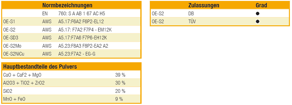 Ebenso ist OP 192 durch das feinschuppigen Nahtaussehens und der guten Schlackenentfernbarkeit für Kehlnähte bestens geeignet. Es ist für das Schweißen an Gleich- und Wechselstrom beim Eindrahtverfahren bis etwa 1000 A belastbar.
