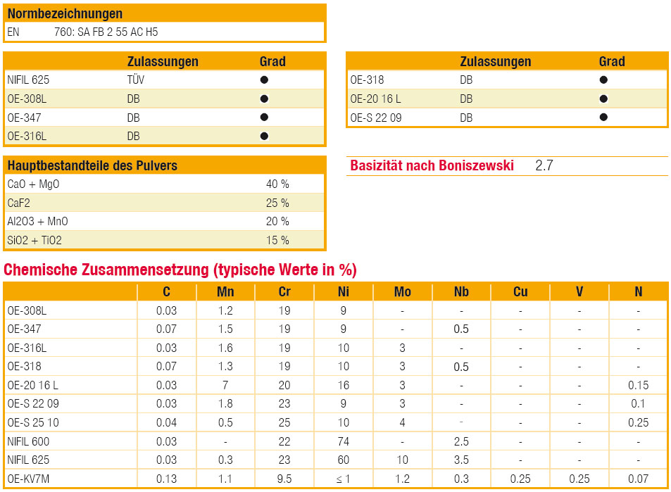 Das Pulver ist hoch basisch und zeigt daher eine hohe Rissunempfindlichkeit. Daher ist seine Anwendung besonders empfehlenswert bei Verbindungsschweißungen an dicken Ouerschnitten.