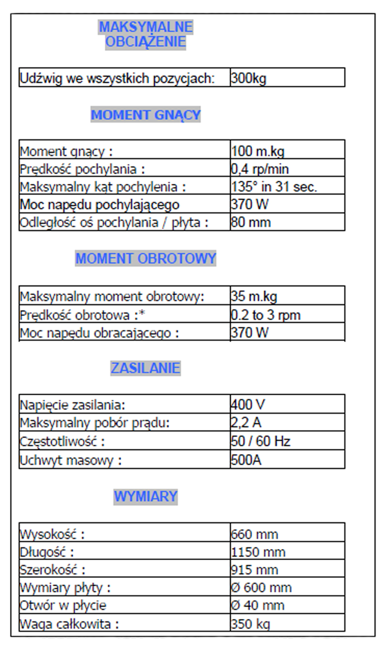 Waga elementu wynosząca 300 kg, jest dla jego środka ciężkości, który nie może być odsunięty dalej niż 253mm od płyty w pionowym położeniu. Odległość środka ciężkości od osi pozycjonera nie może być większa niż 117mm.