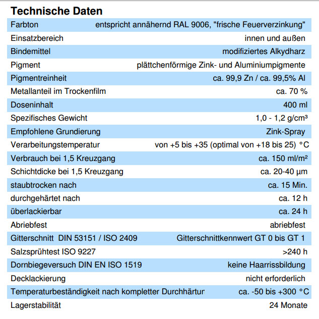 Es bildet eine schnelltrocknende, festhaftende Schutzschicht aus mikrofeinen Zinkflakes. Die Zinkflakes bilden eine widerstandsfähige Schutzschicht auch gegen extreme Witterungs- und Umwelteinflüsse.