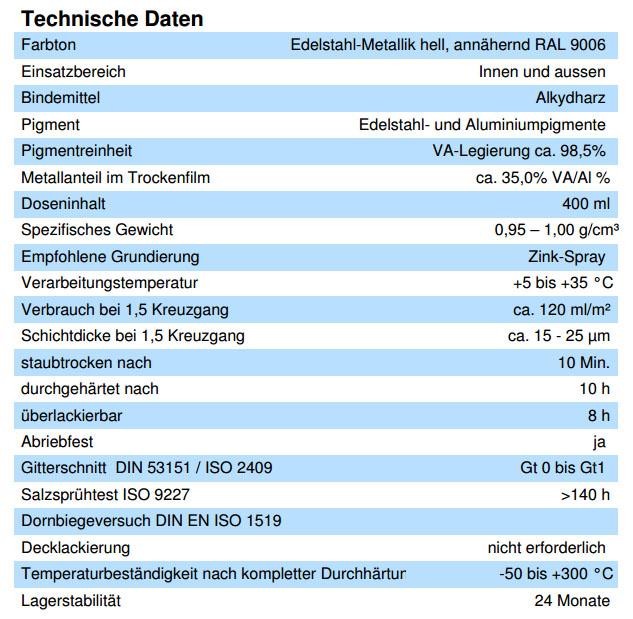 WEICON Edelstahl-Spray spezial hell ist eine chemikalienbeständige, korrosions- und witterungsbeständige Oberflächenbeschichtung auf Basis von Acrylharz und rostfreien Edelstahlpigmenten. Die Legierung ist u.a. zusammengesetzt aus Chrom, Nickel und Mangan. Es verleiht die Optik bereits behandelten Edelstahls.