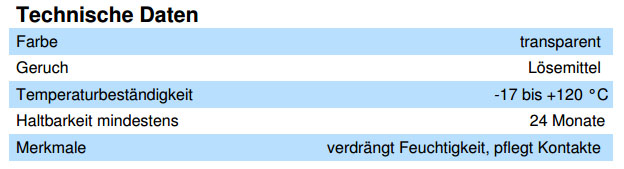 Es verdrängt Feuchtigkeit von elektrischen Kontakten und verhindert Kriechströme und Spannungsverluste und hält Kontakte, Sicherungen, Kabelanschlüsse etc. frei von Oxidation und Sulfidschichten.