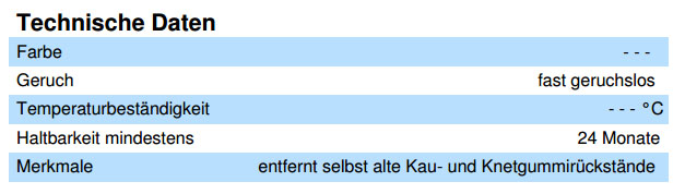 Kaugummi-Entferner entfernt Kau- und Knetgummireste an Polstermöbeln, Bussitzen (Hartschalen), Schulstühlen und -tischen, textilen Bodenbelägen aller Art und auf elastischen und harten Bodenbelägen, wie z.B. Holz- und Steinböden, PVC- und Linoleumböden.