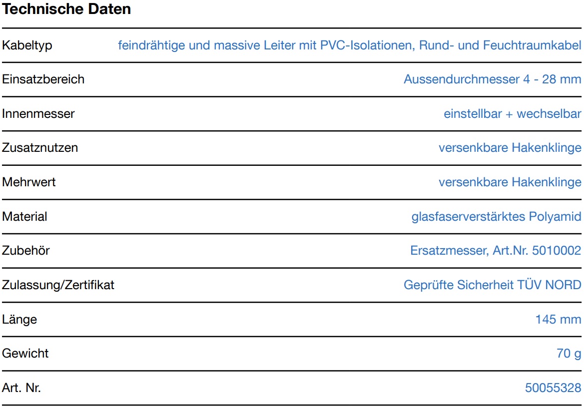 Arbeitsbereich: 4 - 28 mm Ø vollergonomisch & komplett isoliert. Stufenlos regulierbare und leicht bedienbare. Stellschraube Präzises, schnelles und sicheres Entmanteln.