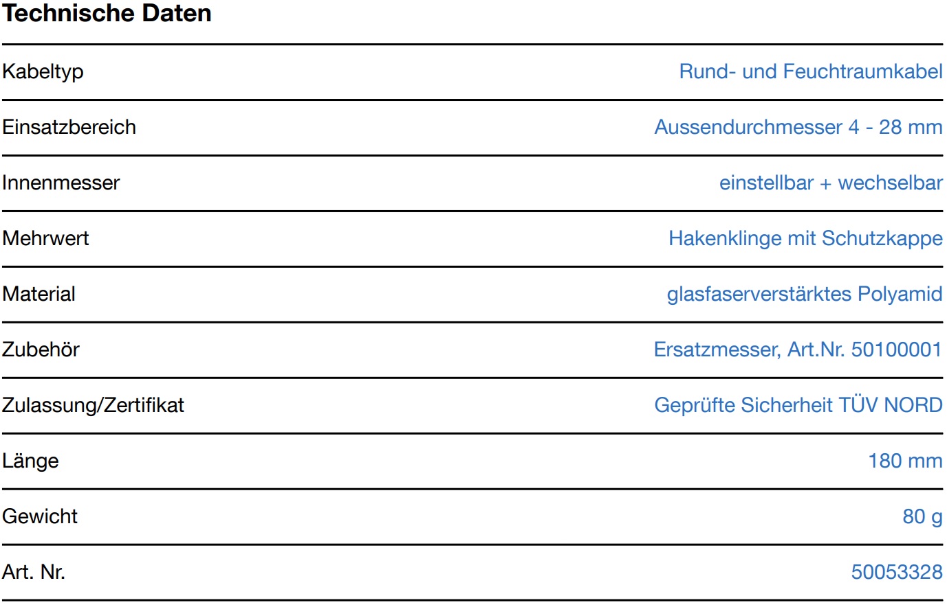 Stufenlos regulierbare und leicht bedienbare. Stellschraube Selbstdrehendes Innenmesser. Präzises, schnelles und sicheres Entmanteln.
