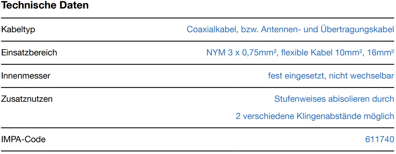 Arbeitsbereich 4,8 - 7,5 mm Ø. Einstellung der Schnitttiefe ist nicht erforderlich. Auch für flexible Kabel geeignet Längenskala (0 - 17 mm) im Gehäuse integriert. Stufenweises Abisolieren aller gängigen Coaxial-Kabel.