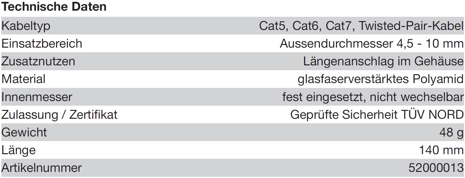 Arbeitsbereich: 4,8 - 10 mm Ø. Für Twisted-Pair-Kabel der Kategorien 5, 6, 7 (Cat5, Cat6, Cat7). Integrierter Anschlag, auf die gewünschte Länge einstellbar. Sicheres Arbeiten durch ergonomischen, rutschfesten Griff.