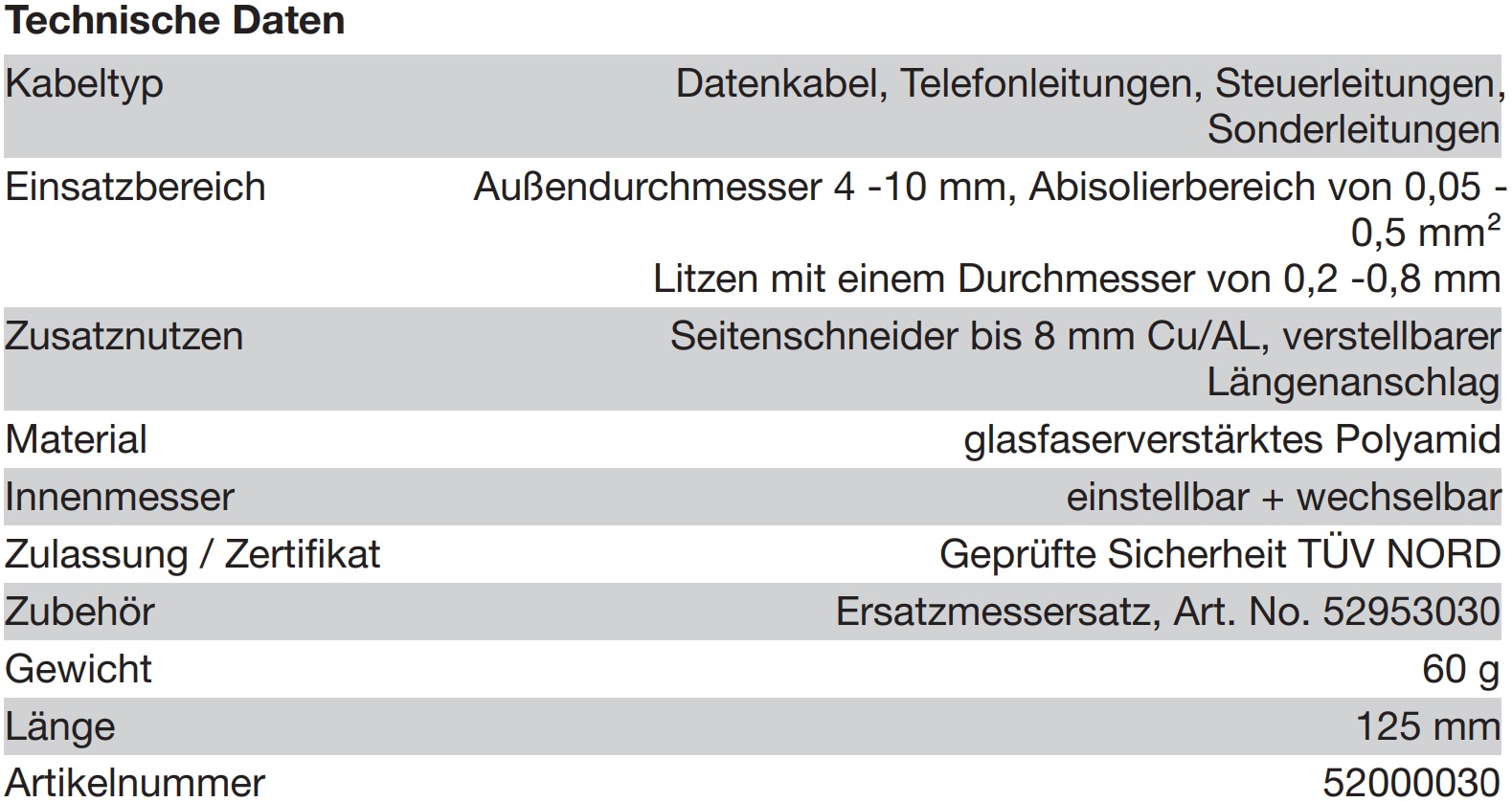 Arbeitsbereich 0,05 - 0,5 mm² / 4 - 10 mm Ø. Abisolieren von Leitern und Litzen z.B. auch bei Telefonleitungen Präzises. Abisolieren durch verstellbaren Längenanschlag (3,5 - 14 mm). Integrierter, gut zugänglicher Seitenschneider bis 8 mm Ø Entfernen der Außenisolierung bei Datenkabeln.