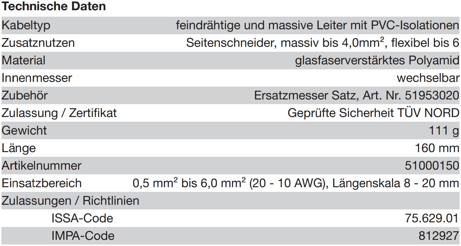 Arbeitsbereich 0,5 - 6 mm². Präzises Arbeiten durch integrierte Längenskala. Integrierter und gut zugänglicher Seitenschneider bis 6 mm². Erlaubt schnelles und einwandfreies Abisolieren.