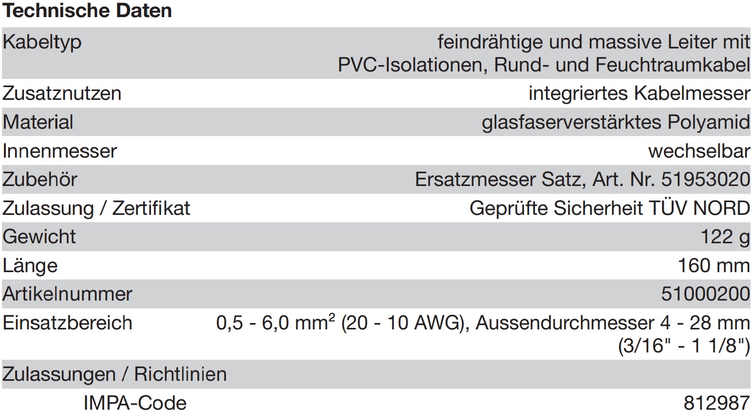 Schnelles und einfaches Abisolieren von 0,5 mm² bis 6,0 mm². Entmanteln: Arbeitsbereich 4 - 28 mm Ø. Reserveklinge in der Griffschale.