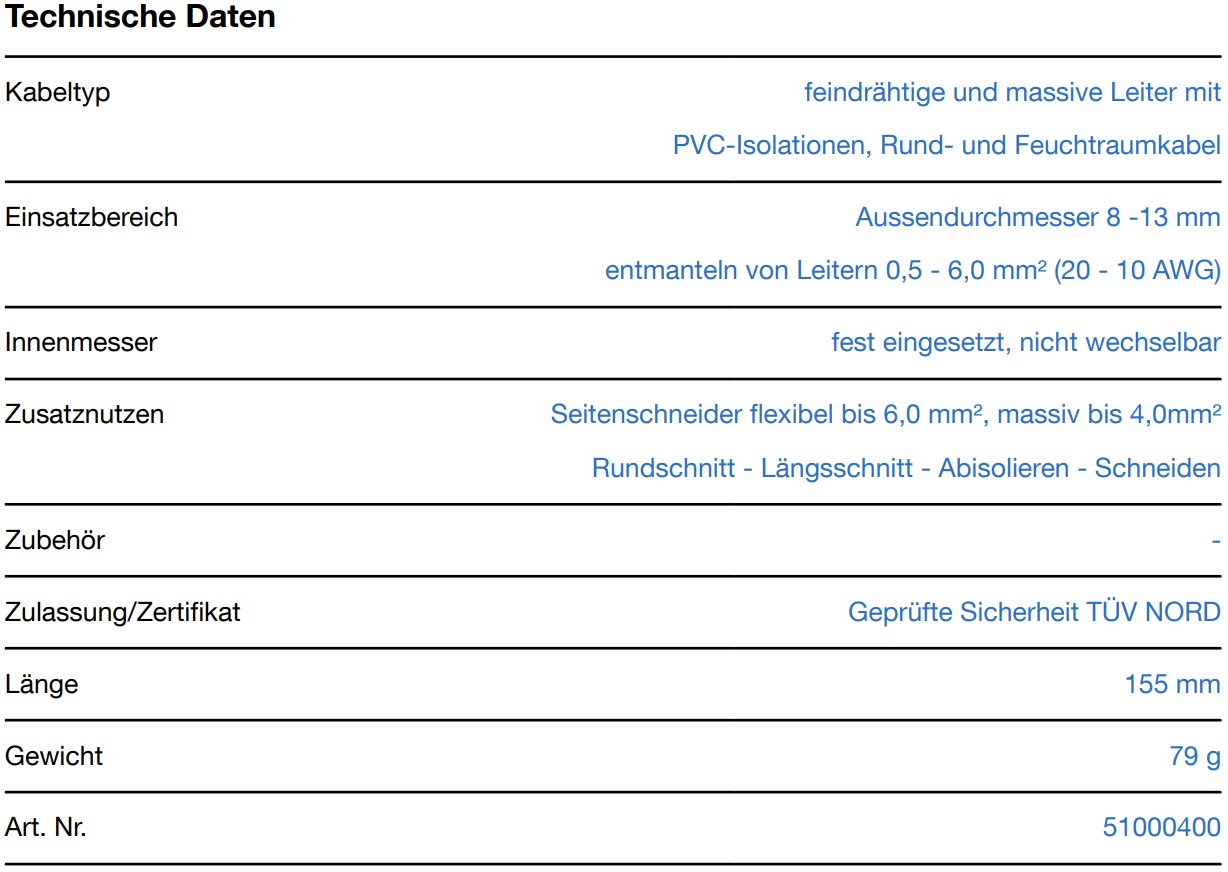 Arbeitsbereich: 0,5 - 6 mm² / 8 - 13 mm Ø. Präzises Entfernen von Abdeckungen auch an schwer zugänglichen Stellen. Sichere und kompakte Aufbewahrung dank Verschluss.