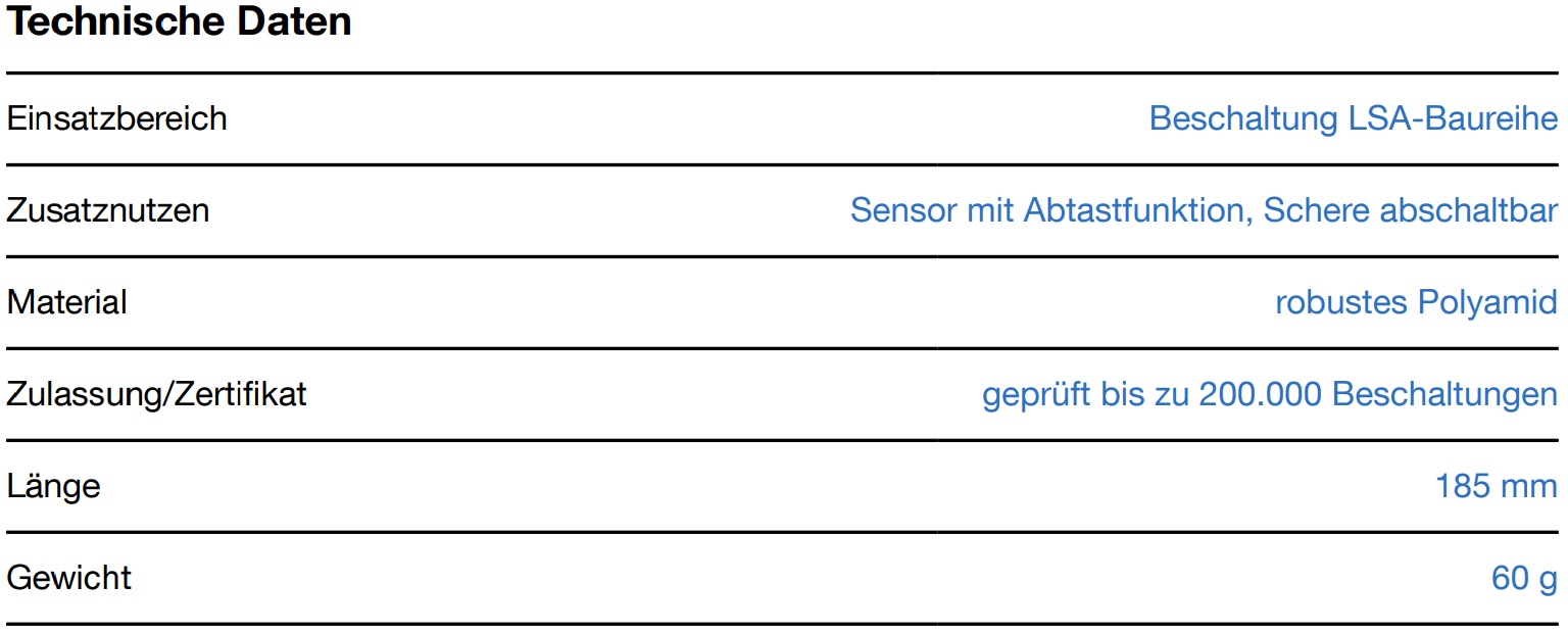 Mit ausklappbarem Ziehhaken und Entriegelungsklinge für Leiterdurchmesser 0,35 - 0,9 mm und Aderdurchmesser 0,7 - 2,6 mm. Besitzt einen Sensor zur Abtastung der Aderendlage.