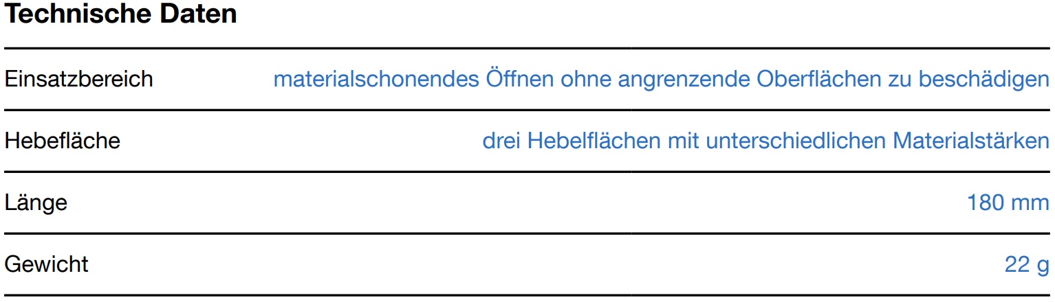 Ideal zum Lösen von Schaltern, Leuchten oder ähnlichen Elementen filigrane schlanke Bauweise – flexibel und stabil zugleich drei Hebelflächen mit unterschiedlichen Materialstärken.