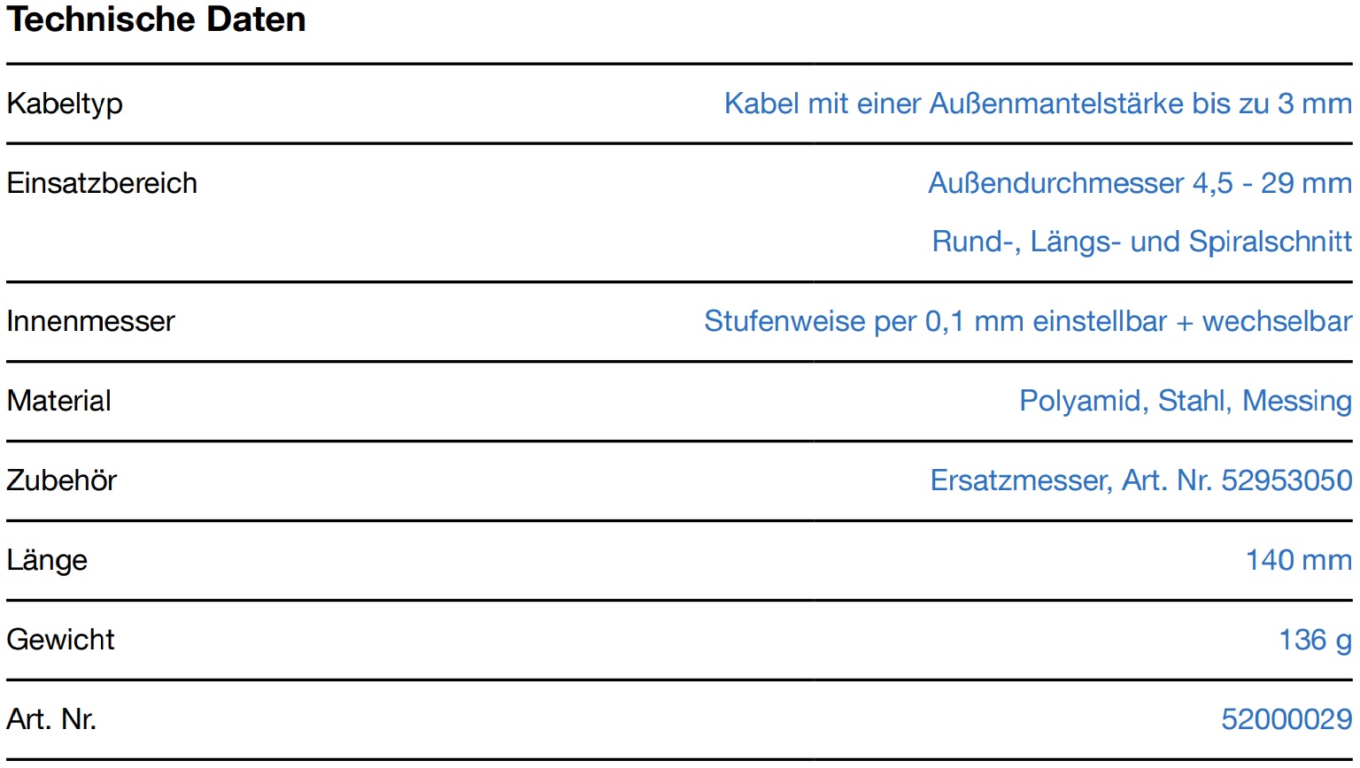 - Rund-, Längs- und Spiralschnitte für weiche und harte Kabel