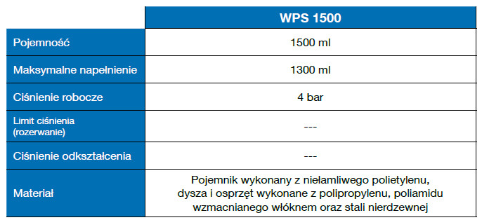Weicon WPS 1500 to dozownik ciśnieniowy wielokrotnego użytku, który znakomicie sprawdza się przy podawaniu wielu płynów technicznych WEICON. Dopompowywanie czystego powietrza poprzez ręczny tłok powoduje wytwarzanie się nadciśnienia w zbiorniku płynu. Gdy ciśnienie przekracza dopuszczalną wartość 4 bar, automatycznie otwiera się zainstalowany zawór bezpieczeństwa. Naciśnięcie przycisku inicjuje stabilne i stałe wypływanie preparatu. Istnieje możliwość płynnej regulacji intensywności natrysku (od strumienia punktowego do mgiełki) za pomocą śruby dyszy natryskowej.