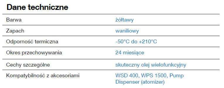 Olej wielozadaniowy WEICON W 44 T® jest produktem łączącym w sobie funkcje ochrony przed korozją, konserwację, wypieranie wilgoci, smarowanie oraz czyszczenie. Możliwość niemal nieograniczonych zastosowań preparatu zagwarantowana jest dzięki jego niezwykłym właściwościom pełznym oraz specjalnej formule. WEICON W 44 T® jest szeroko wykorzystywany w warsztatach, pracach domowych oraz w sektorach transportowym, motoryzacyjnym, rolniczym i elektrycznym.