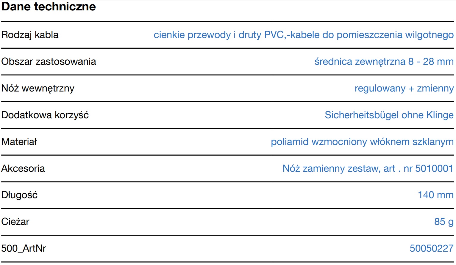 Duża średnica uchwytu zapewnia optymalny kontakt dotykowy. Płynnie regulowane i łatwe w obsłudze pokrętło nastawne. Precyzyjne, szybkie i bezpieczne ściąganie osłonek. Szybka wymiana wewnętrznych nożyków dzięki zamkowi bagnetowemu.