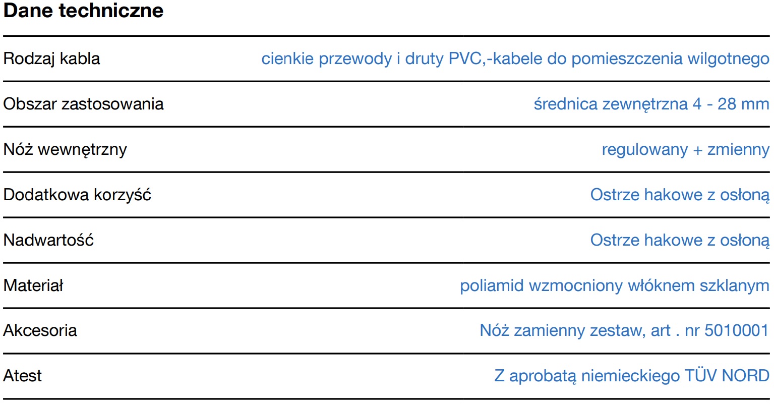 Duża średnica uchwytu zapewnia optymalny kontakt dotykowy. Płynnie regulowane i łatwe w obsłudze pokrętło nastawne. Precyzyjne, szybkie i bezpieczne ściąganie osłonek. Szybka wymiana wewnętrznych nożyków dzięki zamkowi bagnetowemu.