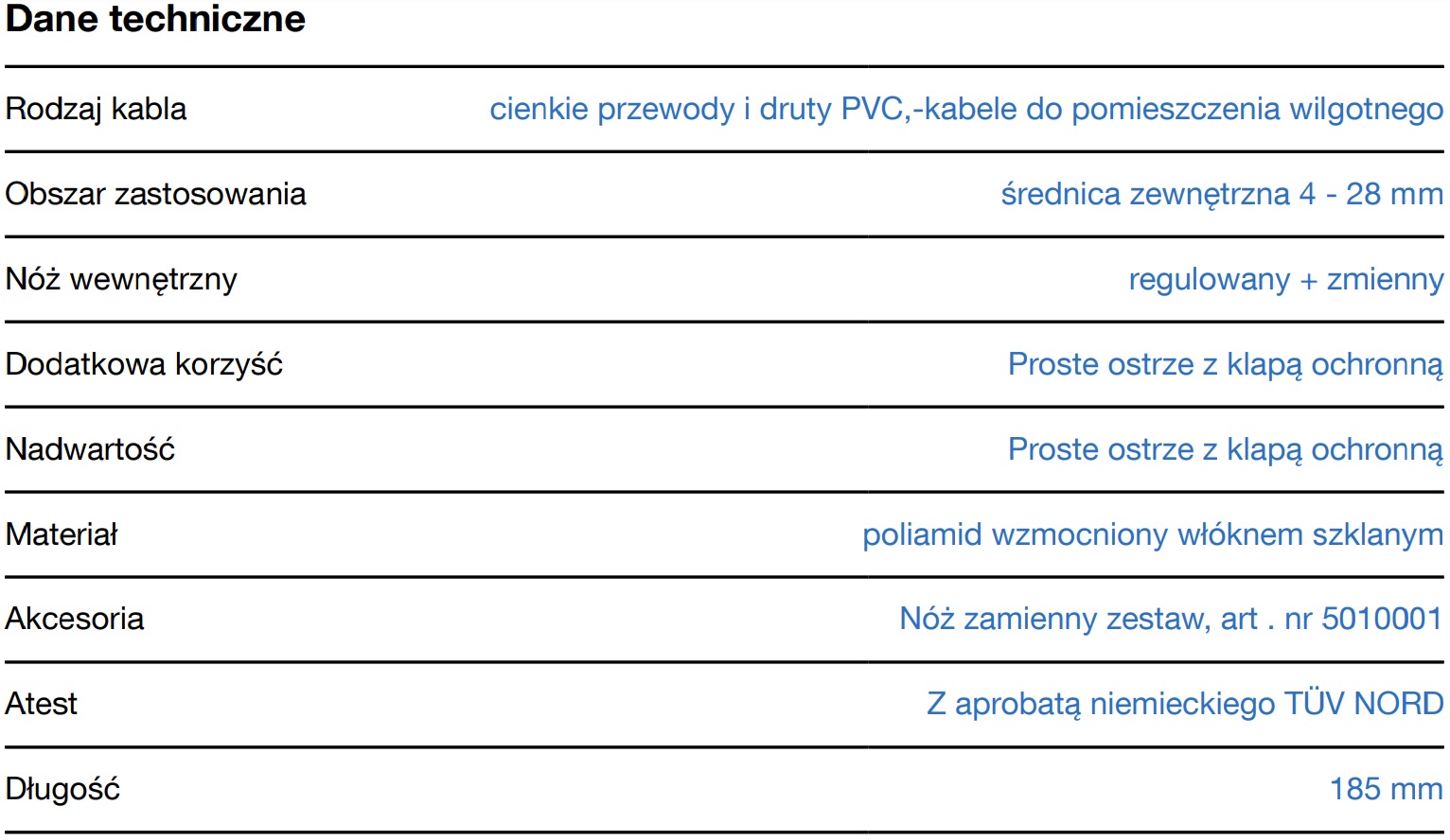 Duża średnica uchwytu zapewnia optymalny kontakt dotykowy. Płynnie regulowane i łatwe w obsłudze pokrętło nastawne. Precyzyjne, szybkie i bezpieczne ściąganie osłonek. Szybka wymiana wewnętrznych nożyków dzięki zamkowi bagnetowemu.