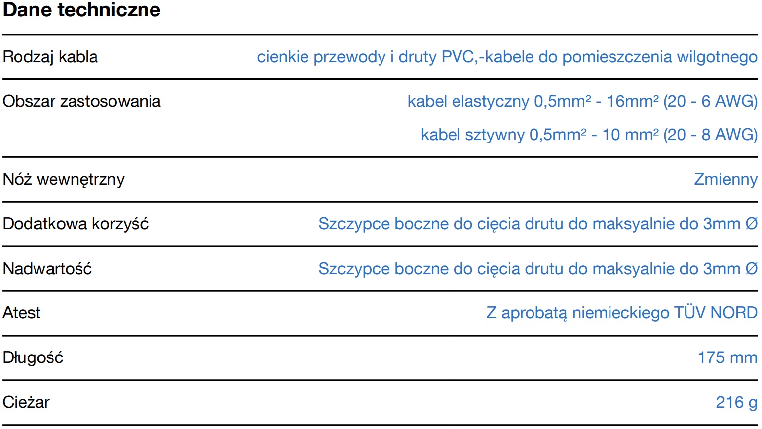 Obszar roboczy: przewody 0,5 - 16 mm², przewody sztywne 0,5 - 10 mm². Dokładna praca dzięki optycznemu wymiarowi długości. Zintegrowany, łatwo dostępny boczny obcinacz do 3 mm Ø.