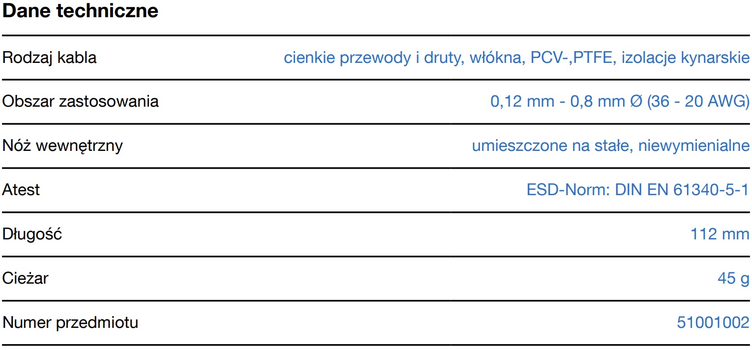 - szybkie, łatwe i precyzyjne zdejmowanie izolacji cienkich przewodów i drutów