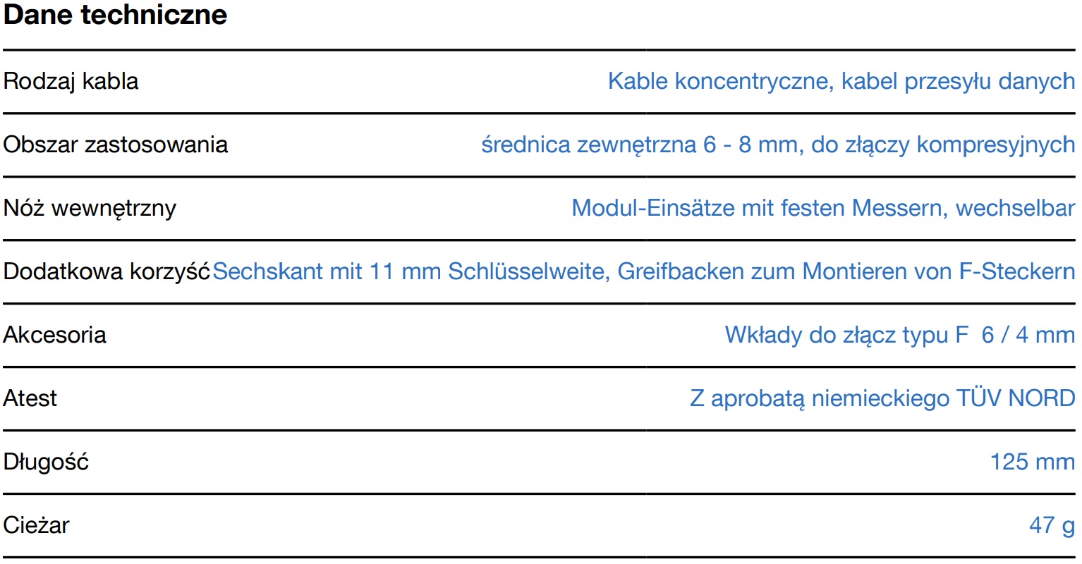 Poręczne narzędzie do montażu i demontażu złącza typu F ze zintegrowanym otwartym kluczem sześciokątnym SW 11 mm. Szczęki chwytające do nakręcania na kabel złącza kompresyjnych.