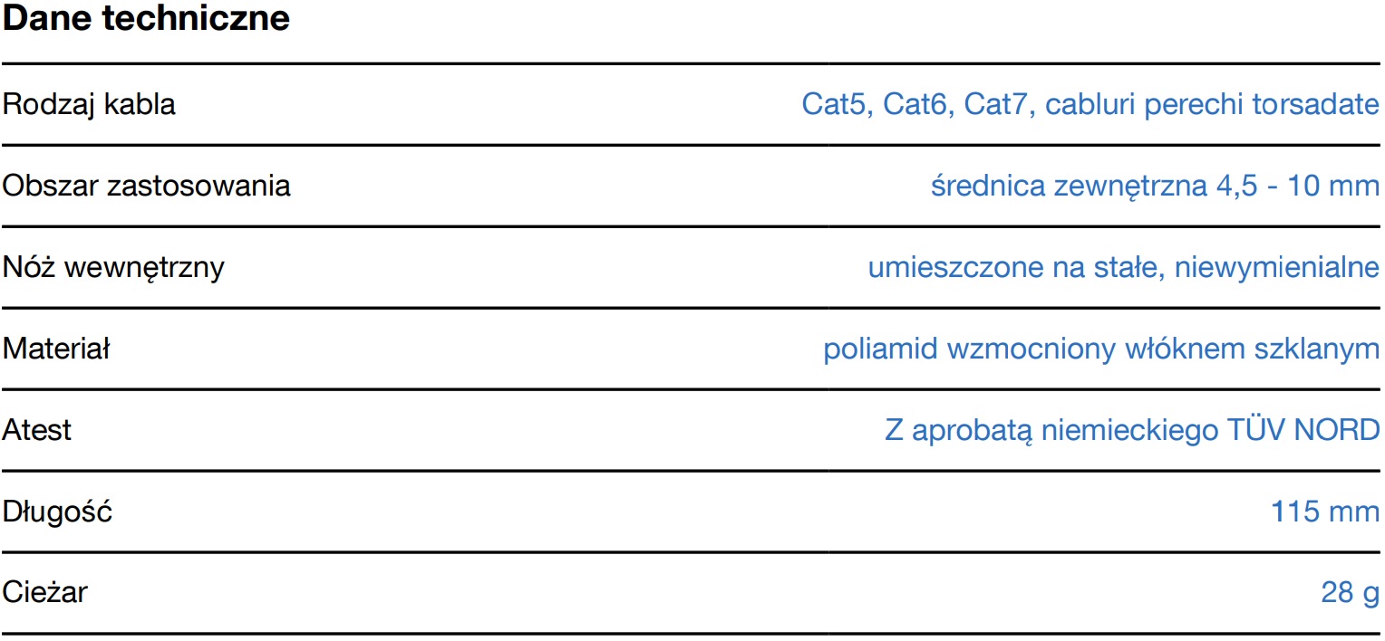 Stopniowane ściąganie izolacji z wszystkich powszechnie stosowanych kabli koaxialnych (np. Cat5, Cat6, Cat7, Twisted-Pair-Kabel). Nie jest potrzebne ustawienie głębokości cięcia. Nadaje się także do kabli elastycznych.