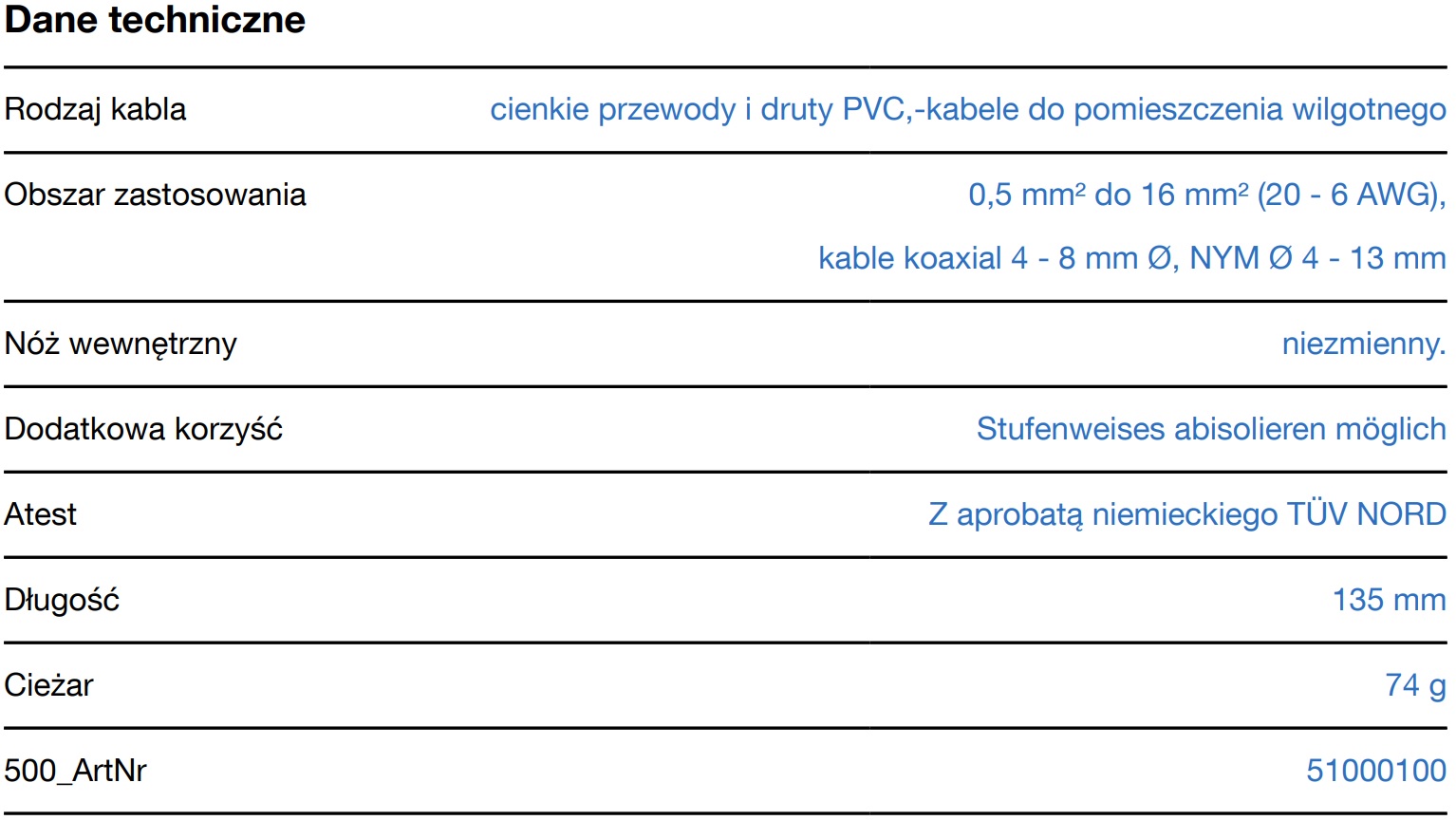 Obszar roboczy: 0,5 - 16 mm² / 4 - 13 mm Ø. Do wielu różnych rodzajów kabli w instalacjach domowych. Dokładne zdejmowanie osłonek w strefach sufitowych i przyściennych. Możliwe cięcia okrągłe i wzdłużne.