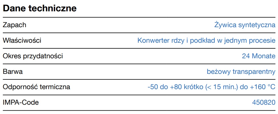 Rust Converter skutecznie neutralizuje rdzę na żeliwnych i stalowych powierzchniach. Zabezpiecza przed korozją w aplikacjach na zewnątrz i wewnątrz. Środek bazuje na żywicy epoksydowej i w reakcji z warstwą rdzy wytwarza metalicznoorganiczny kompleks żelaza. Takie wiązanie jest stabilizowane specjalną żywicą epoksydową, zabezpieczającą metale przed wpływem zewnętrznym. Powstająca w wyniku aplikacji czarna powłoka stanowi warstwę bazową i jest dobrym podkładem przed dalszym nakładaniem powłok stałych. Produkt zabezpiecza przed korozją, posiada świetne właściwości penetrujące i wysoką nieprzepuszczalność dla światła. Oprócz odporności na temperatury do +80°C (poniżej 15 min- do nawet +160°C), powłoka wykazuje również dużą odporność na warunki pogodowe, promieniowanie UV a także rozpuszczalniki. Weicon Rust Converter jest bezzapachowy i nie zawiera metali ciężkich ani kwasów mineralnych. Środek może być stosowany na wszelkie powierzchnie pokryte rdzą, np. w maszynach przemysłowych, sprzęcie rolniczym czy pojazdach mechanicznych, jak również w charakterze powłoki ochronnej zabezpieczającej przed korozją.