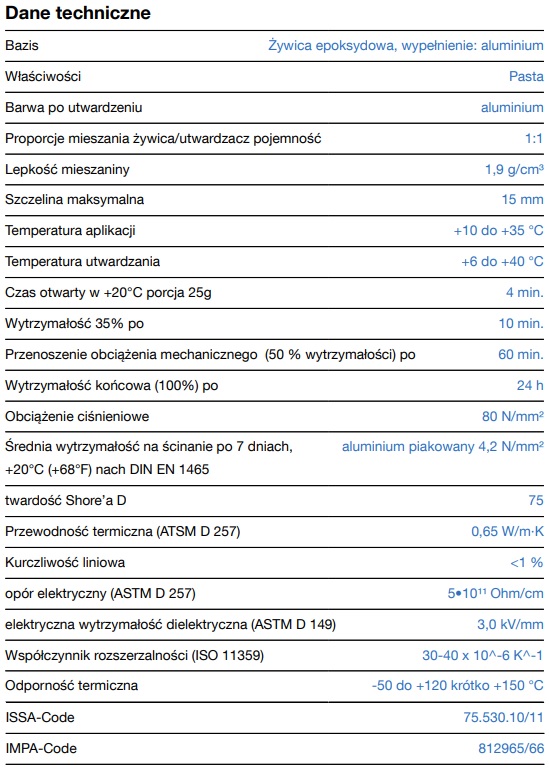 Weicon Repair Stick Aluminium jest przeznaczony do szybkich i niekorodujących wypełnień a także do łączenia części aluminiowych. Likwiduje pęknięcia, otwory i przecieki w karoserii, skrzyniach biegów, framugach i profilach okiennych oraz jednostkach pływających i modelach. Może być stosowany przy konstrukcji maszyn, w sektorze motoryzacyjnym, produkcji przekładni, okien, modeli jak również w wielu innych aplikacjach.
