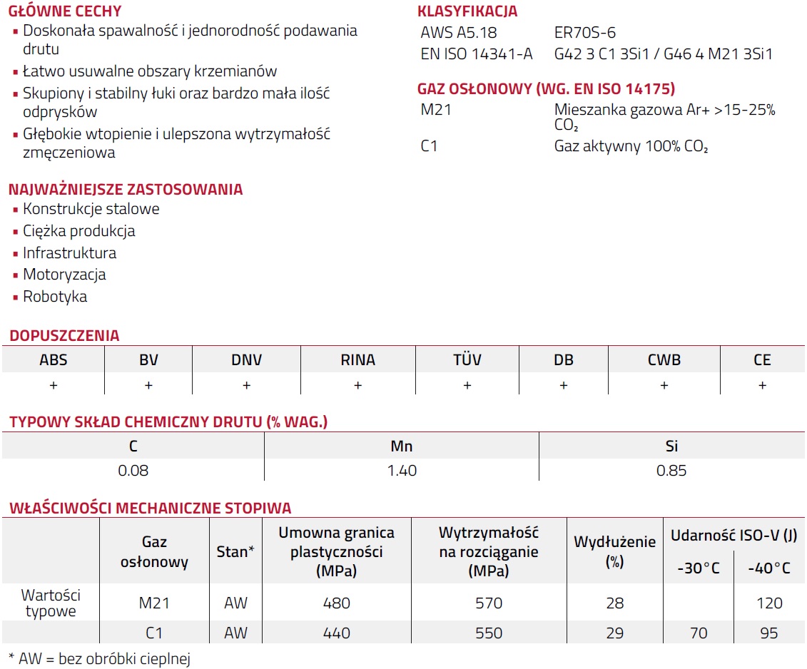 Drut spawalniczy Lincoln SUPRAMIG HD to drut lity o oznaczeniu ER70S-6 / G42 3 C1 3Si1 / G46 4 M21 3Si1, do spawania automatycznego i półautomatycznego. Zapewnia świetną spawalność a także jednorodne podawanie. Drut sprawia, że obszary krzemianów są łatwo usuwalne. Stabilny i skupiony łuk oraz mała ilość odprysków zapewniają wysoką wydajność. Drut zapewnia głębokie wtopienie oraz ulepszoną wytrzymałość zmęczeniową. Do głównych zastosowań drutu należy spawanie konstrukcji stalowych, ciężkiej produkcji, infrastruktury, motoryzacji a także robotyki. Podczas pracy drutem SUPRAMIG HD możliwe jest stosowanie jako gazu osłonowego mieszanki gazowej Ar+ >15-25% CO2 lub gazu aktywnego 100% CO2.