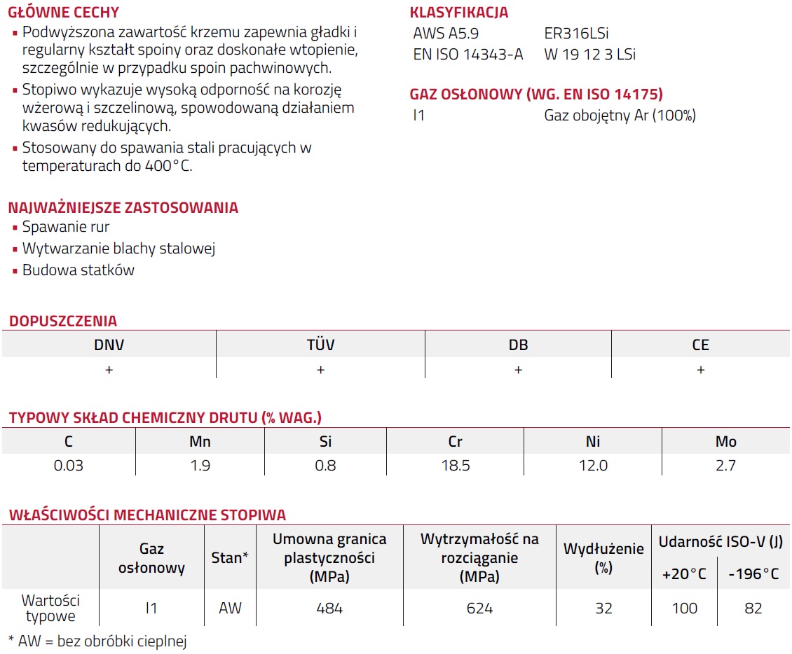 Pręty do stali, o oznaczeniu ER316LSi / W 19 12 3 LSi, Lincoln LNT 316LSi posiadają podwyższoną zawartość krzemu, co zapewnia gładki oraz regularny kształt spoiny a także doskonałe wtopienie. Jest to szczególnie przydatne w przypadku spoin pachwinowych. Stopiwo charakteryzuje się wysoką odpornością na korozję wżerową oraz szczelinową, która spowodowana jest działaniem kwasów redukujących. Pręty są stosowane do spawania stali które pracują w temperaturach 400 ºC. Do najważniejszych zastosowań prętów LNT 316LSi należy spawanie rur, wytwarzanie blachy stalowej oraz budowa statków. Spawanie odbywa się w osłonie gazu obojętnego Ar (100%).