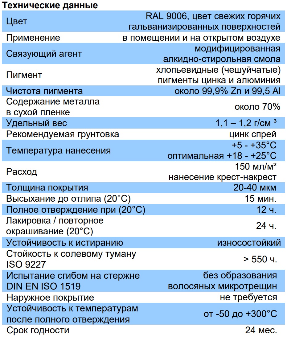 Продукт создает хорошо прилипающее защитное покрытие, которое быстро сохнет и состоит из микрочастиц цинка в виде хлопья. Эта форма элементов заменяет традиционные сферические пигменты и обеспечивает более высокую устойчивость защитного слоя к суровым условиям окружающей среды и погодным условиям. Цинковый спрей "light" подходит для использования в качестве антикоррозионного грунта, предназначенного для локальной коррекции просверленных или сваренных элементов, а также в качестве промежуточного проводящего слоя, используемого для точечной сварки.