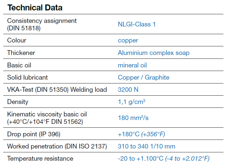 WEICON Copper Paste Assembly Spray обладает высоким термическим сопротивлением и превосходными разделяющими и смазывающими свойствами, обеспечивая при этом высокую защиту от коррозии. Не содержит серу, никеля или свинца.