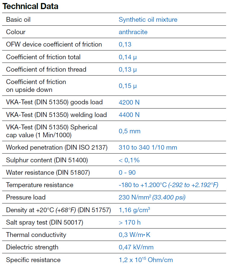 Паста является отличной защитой от истирания и абразивного износа, коррозии, окисления, явления «slip stick», коррозии из-за истирания и электролитических реакций (холодная сварка).
