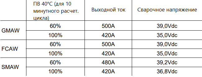 Полуавтоматический сварочный аппарат Powertec i500S, произведенный Lincoln Electric, представляет собой надежное устройство, отличающееся высокой производительностью и долговечностью, что делает его идеальным для самых требовательных применений в промышленности даже в самых тяжелых условиях работы. Аппарат размером 932 мм х 560 мм х 925 мм и весом 79 кг позволяет выполнять сварку следующими методами: MIG/MAG (GMAW), MMA (сварка покрытым электродом - SMAW), а также сварку порошковой проволокой (FCAW), обеспечивая стабильные параметры каждого из этих процессов. В сочетании с охладителем Сoolarc-26 Powertec i500S также предлагает возможность процесса строжки. Сварочный аппарат позволяет работать с током в диапазоне 20-500А, в циклах, указанных в следующем списке: