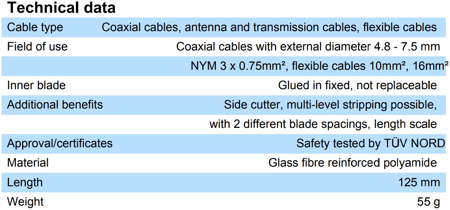 Рабочая зона: 4,8–7,5 мм Ø. Ступенчатая зачистка изоляции всех распространенных коаксиальных кабелей. Также подходит для гибких кабелей. Встроенный и легкодоступный боковой резак до 8 мм.