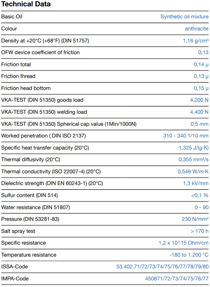 Антикоррозионная паста Weicon Anti-Seize "High-Tech" обладает высокой термостойкостью и отличными разделительными свойствами, не содержит металлов, нейтральна к материалам и одобрена NSF. Паста Anti-Seize "High-Tech" особенно рекомендуется в тех случаях, когда препараты, содержащие металлы, могут вызывать электролитические реакции, требуется экстремальная термостойкость, разрешение на контакт с пищевыми продуктами и эстетический цвет препарата.