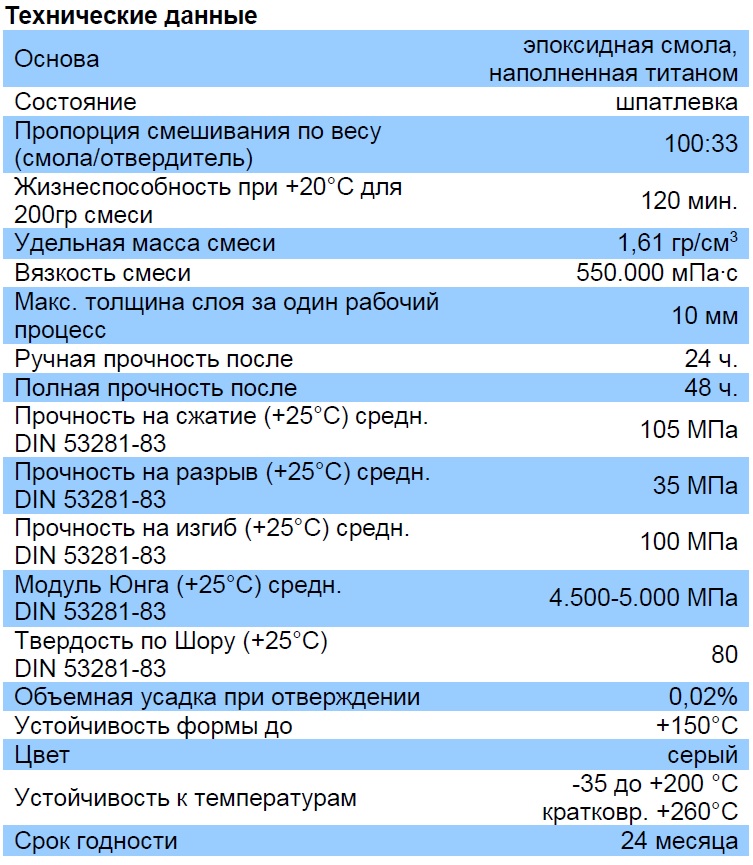 Эпоксидный композит WEICON TI обладает высокой устойчивостью к давлению и очень хорошей химической стойкостью. Особенно подходит для ремонта насосов, клапанов, изнашиваемых пластин, седел шарикоподшипников, валов и гребных винтов, а также подшипников скольжения. WEICON TI также отлично подходит для машиностроения, производства устройств и многих других промышленных применений.